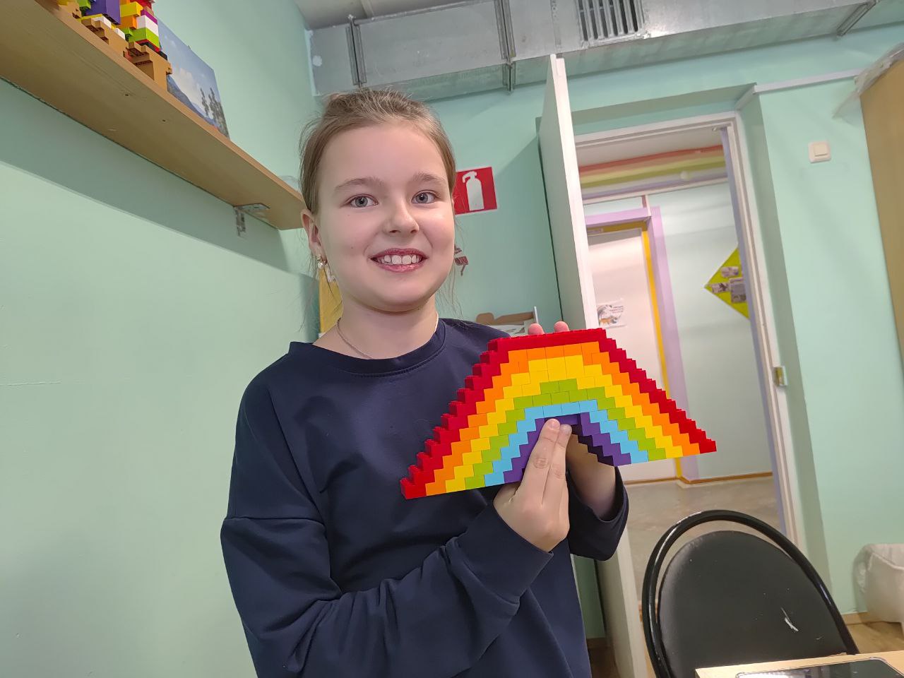 Начинаем с неба. Радуга. Прямо в нашем зале, хотя учреждение называется «Радуга». Яркая, дугой, цвета подобраны чётко. Без неё никак.
