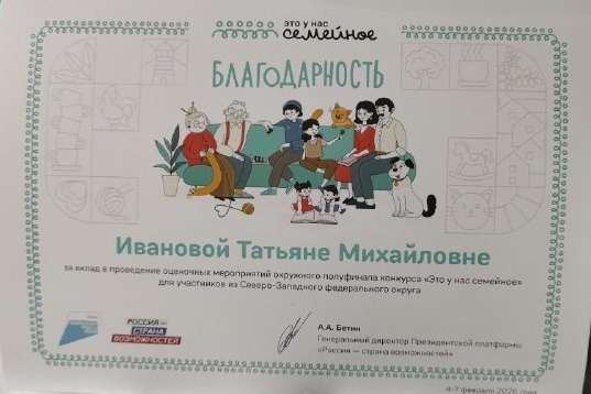 Педагог-организатор ТЦДО «Радуга» Татьяна Михайловна Иванова вернулась из Санкт-Петербурга, где прошёл окружной полуфинал Всероссийского конкурса «Это у нас семейное». Этот конкурс, организованный платформой «Россия — страна возможностей», объединяет самые тёплые и искренние семейные истории со всей страны.