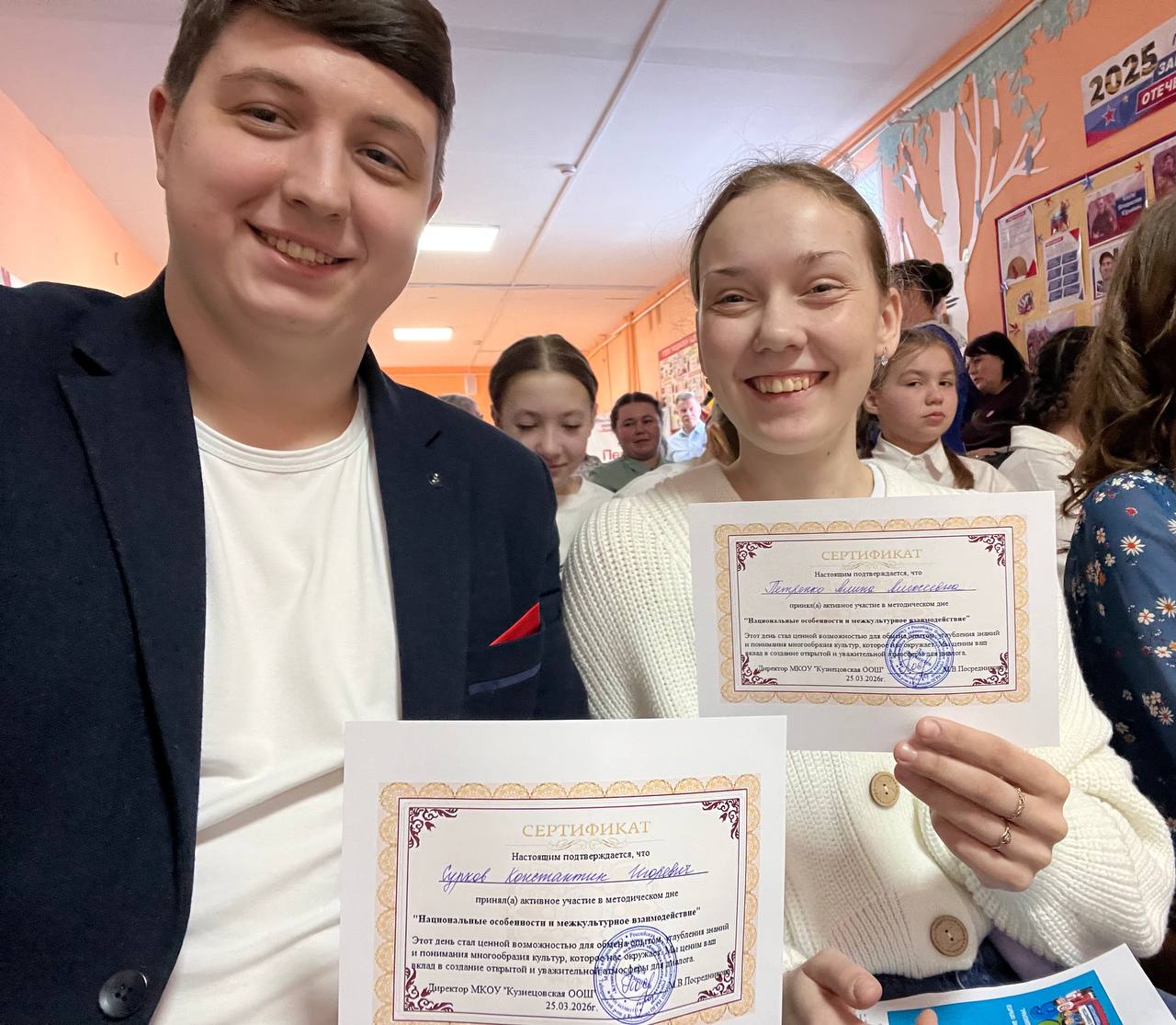 Молодые специалисты МАУ ТЦДО «Радуга» — методист Константин Игоревич Сурков и педагог Алина Алексеевна Петренко — стали участниками методического дня в МКОУ Кузнецовской ООШ. Тема встречи: «Национальные особенности и межкультурное взаимодействие».